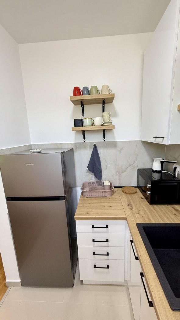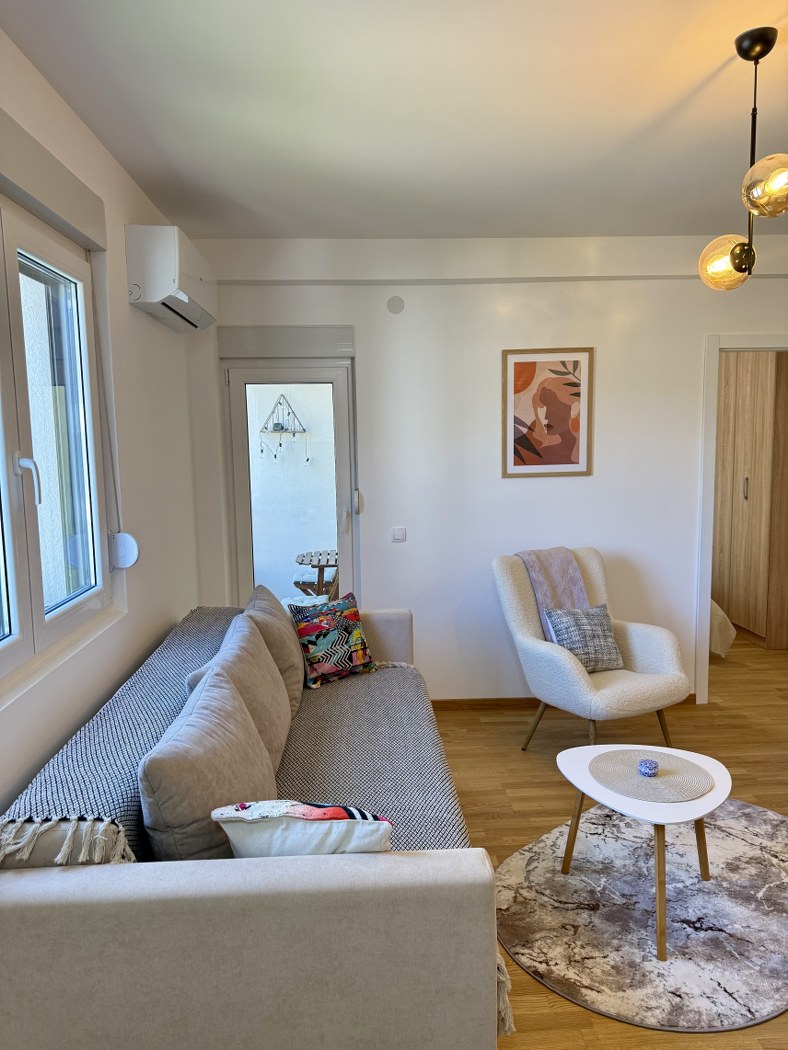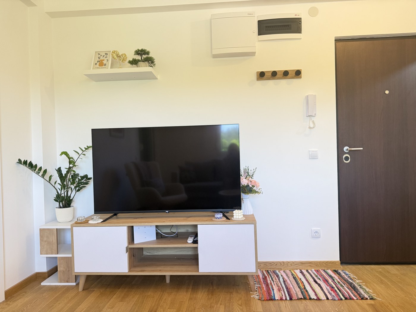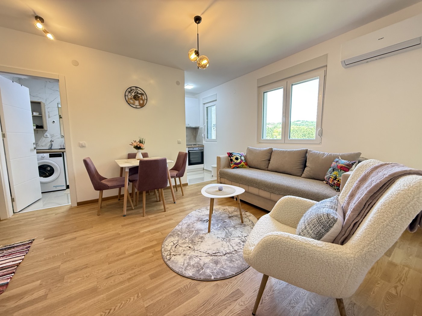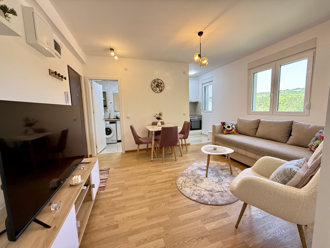 Apartman raspolaže spavaćom sobom sa francuskim ležajem, prostranim dnevnim boravkom sa garniturom na razvlačenje, trpezarijom i kompletno opremljenom kuhinjom, kupatilom, hodnikom i terasom koja pruža predivan pogled na okolnu prirodu.