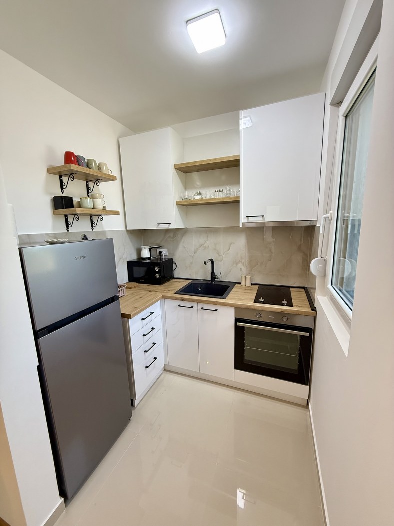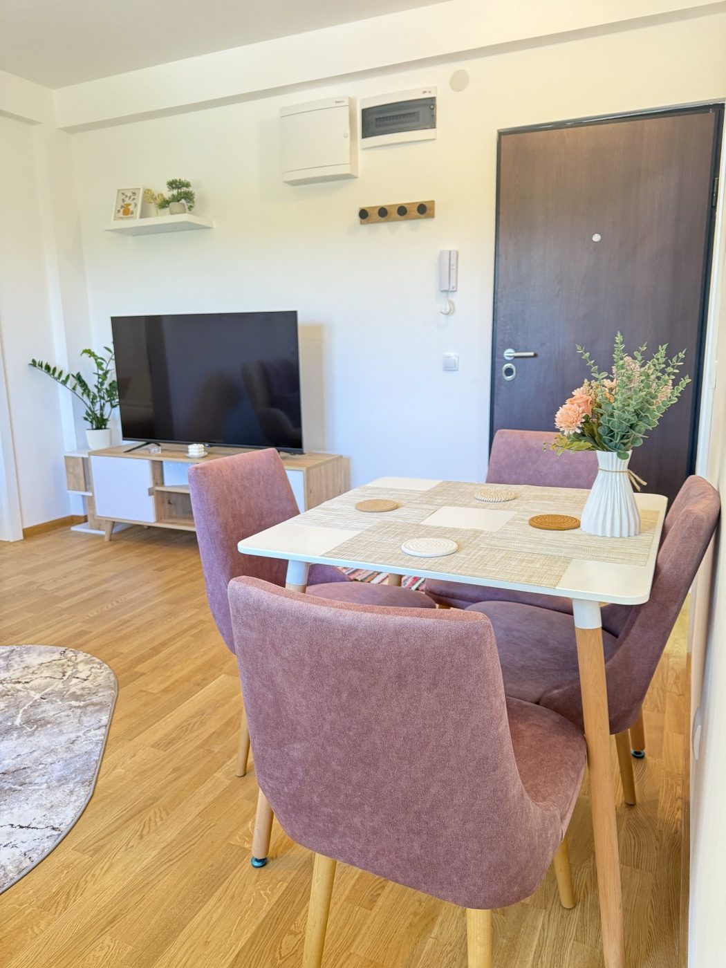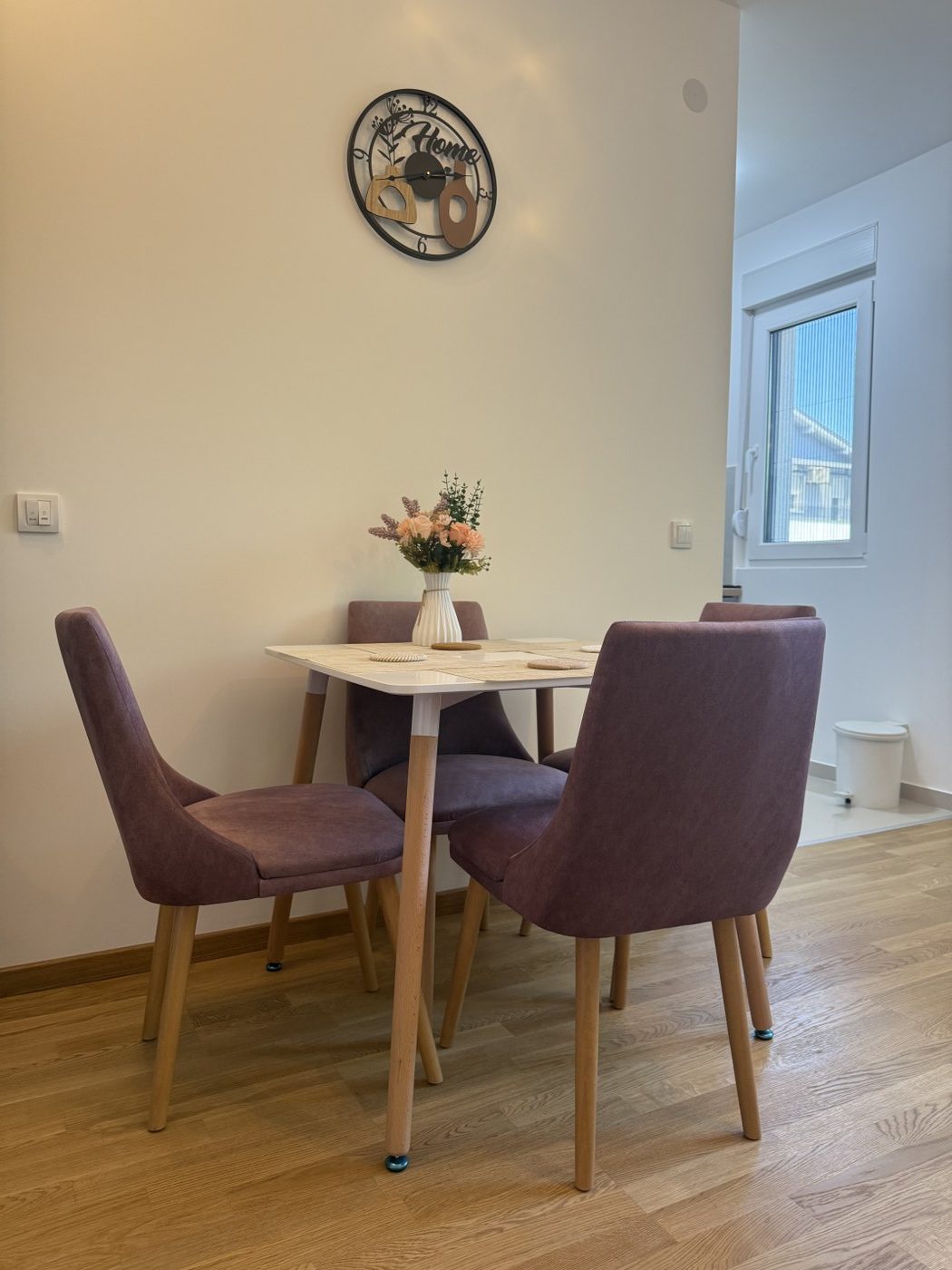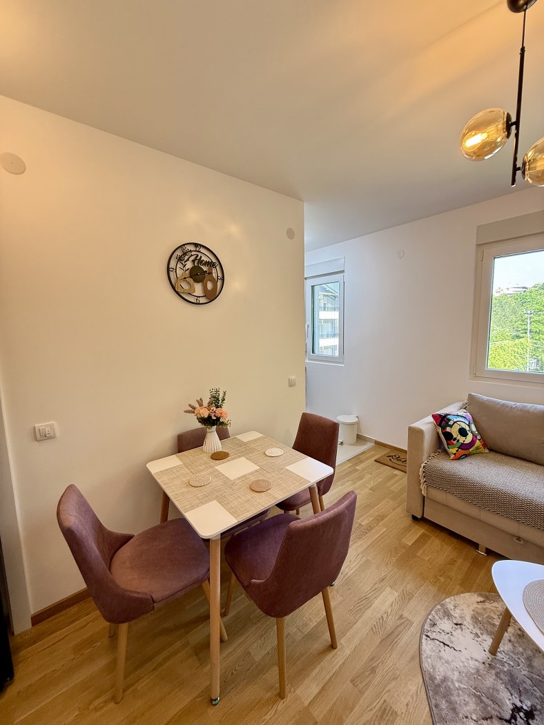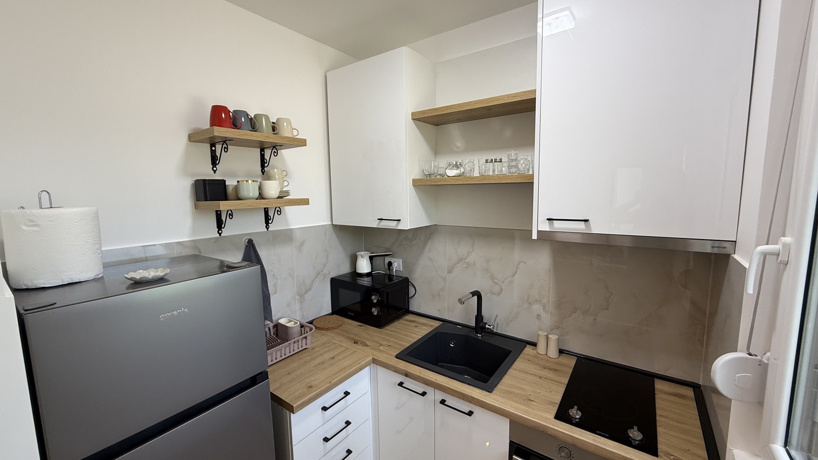 Apartman raspolaže spavaćom sobom sa francuskim ležajem, prostranim dnevnim boravkom sa garniturom na razvlačenje, trpezarijom i kompletno opremljenom kuhinjom, kupatilom, hodnikom i terasom koja pruža predivan pogled na okolnu prirodu.